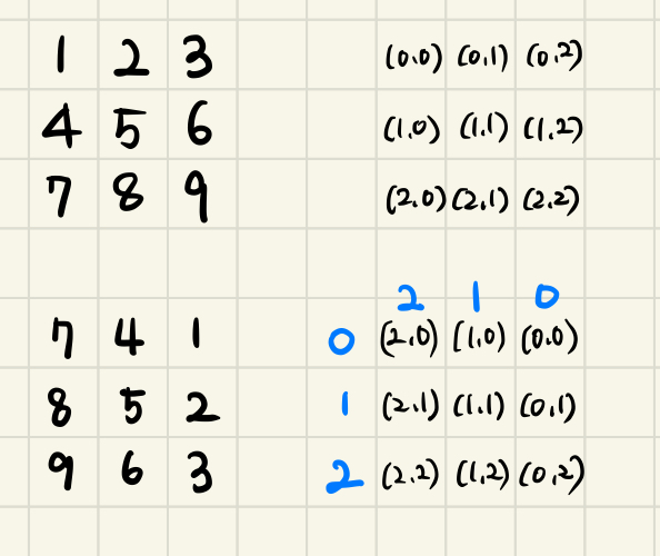 새로운 배열을 반환해도 된다면, zip() 메소드를 사용해서 쉽게 결과물을 구할 수 있다. 하지만 기존 배열을 활용해야 한다면, Rotate()를 하였을 때 기존 값의 위치와 새로운 위치에서 어떤 규칙으로 이동하였는지 찾으면 문제를 풀수 있다. 이런 유형의 문제를 풀 때, 내가 선호하는 방식은 충분히 그릴 수 있을 만한 작은 케이스를 찾아서 직접 위치값(R,C)의 변화를 그려내 규칙을 찾아내는 것이다.
