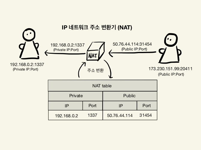 NAT는 내부 네트워크에서 외부 네트워크로 통신을 할 때 IP를 변환하는 기술이다. 변환기 뒤에 있는 로컬 IP 주소 공간을 다른 네트워크가 재사용할 수 있게 하여 주소 부족 문제를 해결한다. 네트워크 끝에 NAT 기기를 설치해서, Private IP와 Port Number를 한 개 이상의 Public IP와 Port Number와 짝지어 관리한다. Private IP는 공유기에서 발급한 IP 주소이므로 외부에서는 이 Private IP로 바로 접근 할 수 없다. 외부에서는 Public IP와 Port Number를 통해 요청하고 위에 그림에서 보는 것처럼 NAT table에서 Public IP, Port Number와 짝을 이루는 Private IP, Port Number를 찾아 주소를 변환시키고 해당 주소로 패킷을 전달해준다.(private에서 public으로 요청할 때도 NAT table을 통해 변환한다).