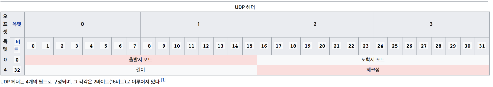 UDP는 NULL 프로토콜이라고도 불린다. 그 이유는 무엇일까. 아래의 UDP 헤더의 구조를 살펴보면 총 8bytes(1bytes = 8bit)로 간단하게 구성되어 있다. 그런데 그마저도 발신지 포트와 체크섬 필드 모두 UDP에서는 선택 입력 필드이다. 아래에서 UDP의 특징에 대해 알아보겠지만 UDP는 네트워크의 혼잡 처리라던가, 패킷 손실에 대한 어떠한 처리도 하지 않는다. UDP가 하는 일이라곤 IP 위 계층에서 통신 호스트의 발신, 수신 애플리케이션 포트를 내장하여 '애플리케이션 다중처리'에 이용하는 것뿐이며, 모든 에러 탐지와 에러 복구가 그 위 계층 애플리케이션에서 이루어진다. 결국 프로토콜치고는 너무 하는 일이 없어서 Null 프로토콜이라고 부르는 것이다.