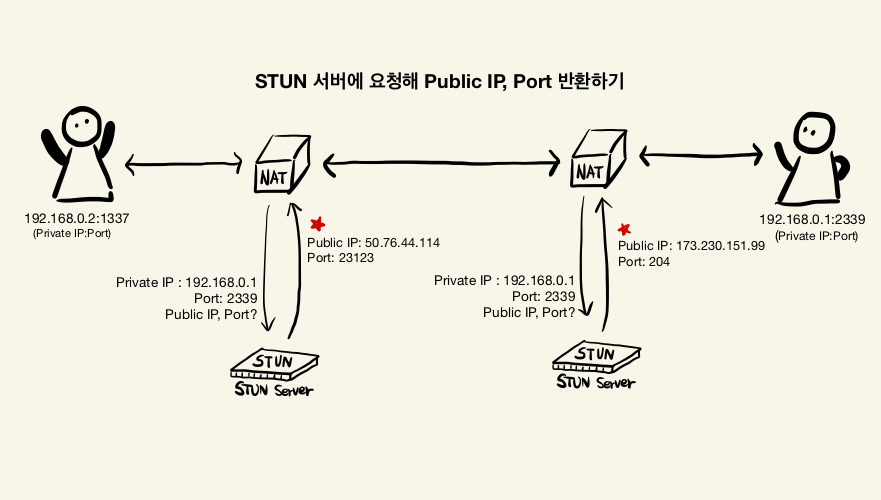STUN은 호스트 애플리케이션이 네트워크상의 NAT 기기를 발견하고 현재의 커넥션에 지정된 Public IP와 Port number를 알아낼 수 있게 하는 프로토콜이다. 이 프로토콜이 올바르게 동작하려면 공용 네트워크상에서 잘 알려진 제3의 STUN 서버의 도움을 받아야 한다. DNS 검색을 통해, 혹은 주소를 직접 지정해서 STUN 서버의 주소를 알아내자. STUN 서버에게 바인딩 요청을 보내면 현재의 Private IP, port의 Public IP, Port를 받을 수 있다. 이 프로토콜을 사용함으로써,