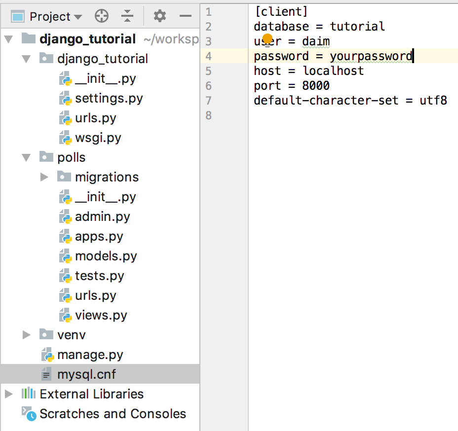 mysql을 설치하고 접속하여 Database를 생성한다. 나는 tutorial로 지었다. settings.py의 DATABASES 변수에서 defalut 값을 sqlite에서 mysql로 DB로 변경한다. 그 다음으로 어떤 database를 사용하는지, user, password, host, port, default_character-set 등을 mysql.cnf 파일에 별도로 저장하고 settings.py에서 읽어와 사용하도록 만든다.( password 처럼 중요한 값들은 별도의 파일에 몰아두고 .gitignore에 따로 저장소에 올라가지 않도록 설정해두면 귀중한 정보가 만천하에 공개되는 위험을 줄일 수 있다)