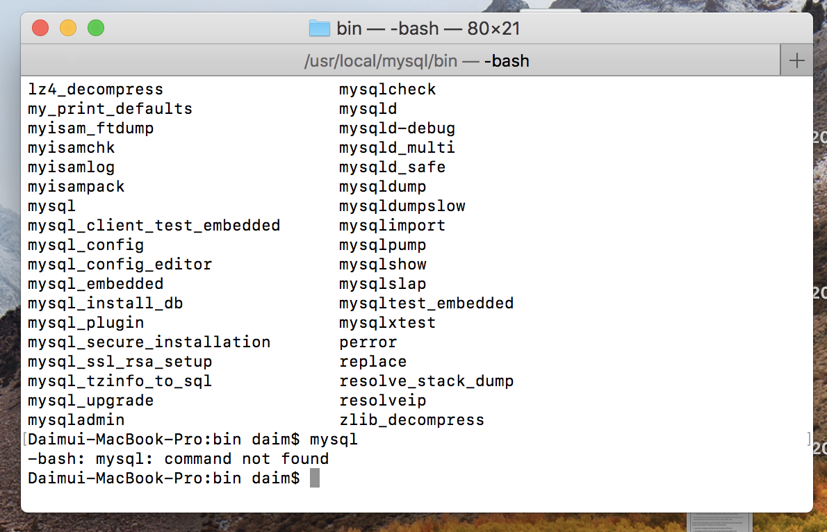명령어를 사용하고도 아무런 응답이 없다면 터미널이 mysql의 위치를 모르고 있다는 것입니다. 환경변수에 mysql의 path를 지정해주면 됩니다. mysql의 위치를 알려주면 나중에는 어느 위치에서든 mysql 명령어 만으로도 쉽게 mysql에 접근해 사용할 수 있습니다.